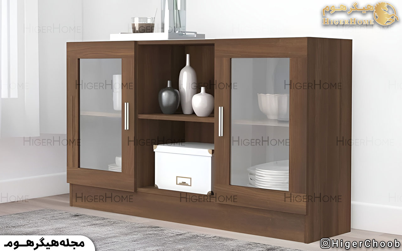 ویترینهای بوفهای معمولاً دارای دربهای شیشهای و قفسه و طبقه داخلی هستند که به خوبی برای نمایش ظروف و اشیاء دکوری مناسب هستند. این مدلها میتوانند در فضای پذیرایی یا نشیمن قرار بگیرند.